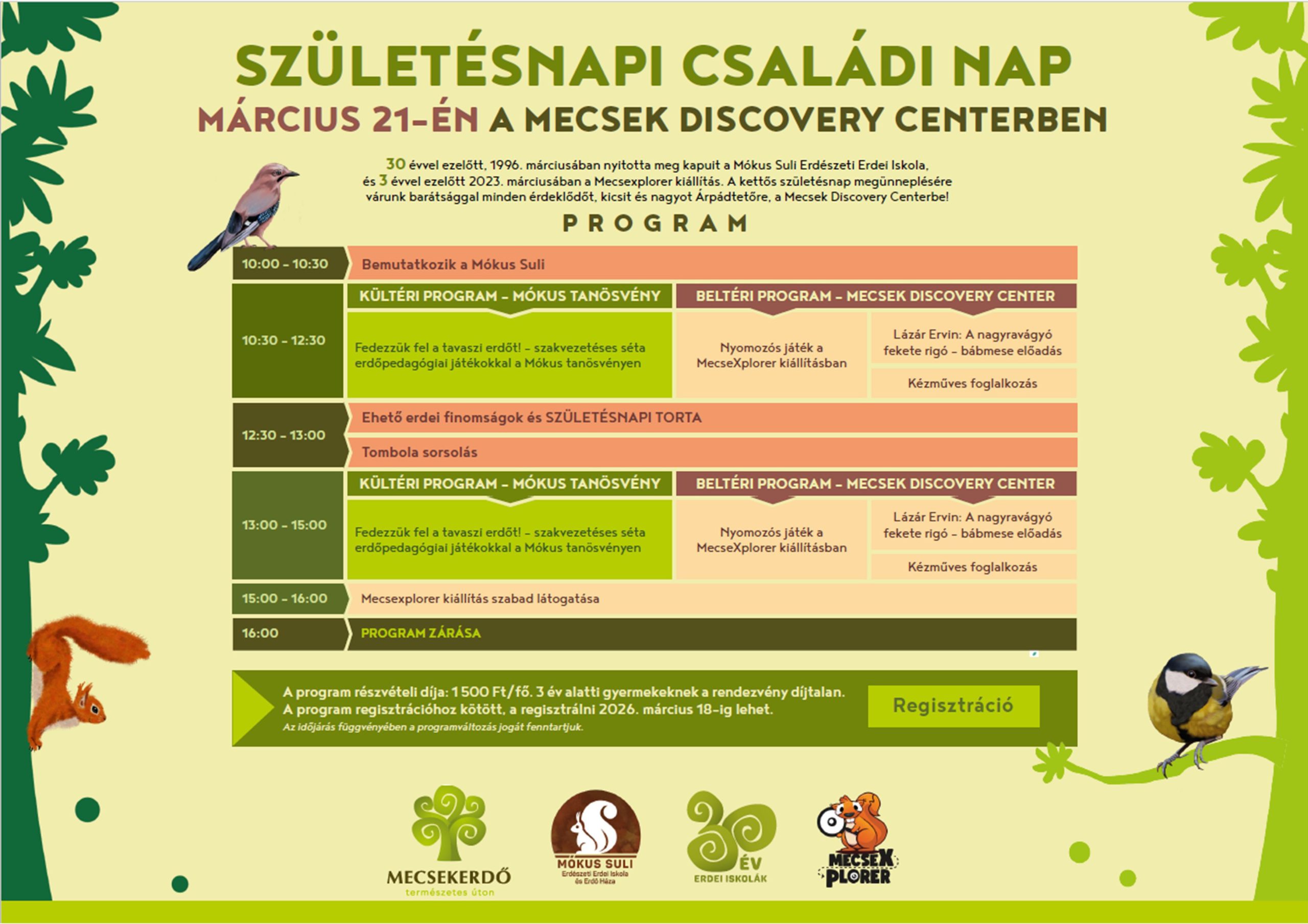 30 évvel ezelőtt, 1996. márciusában nyitotta meg kapuit a Mókus Suli Erdészeti Erdei Iskola és 3 évvel ezelőtt 2022. márciusában a Mecsexplorer kiállítás. E jubileumok megünneplésére várunk barátsággal minden érdeklődőt, kicsit és nagyot Árpádtetőre a Mecsek Discovery Centerbe!